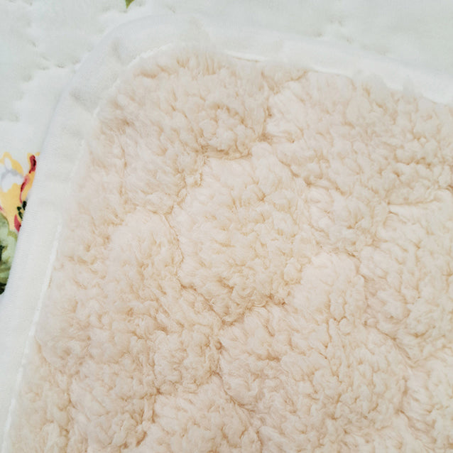 表面にはポリエステル95%ポリウレタン5%の毛足のある柔らかい肌触りのマイクロファイバー素材使用。裏面にはパイル地ポリエステル100%地糸ポリエステル80%レーヨン20%のシープボアを使用。超音波キルト加工で立体的に華やかに。